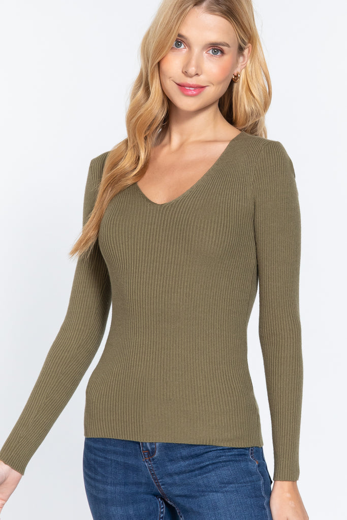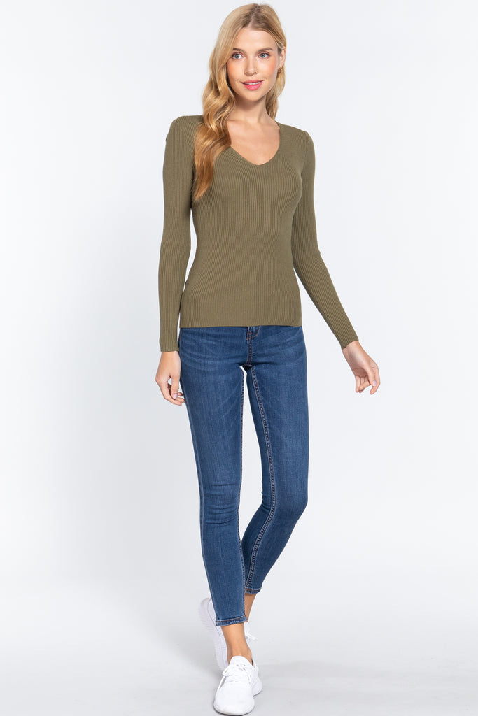 Enhance your wardrobe with our V-Neck Viscose Rib Sweater in French Olive. Add it to your cart now and embrace the perfect blend of cozy sophistication and comfort!