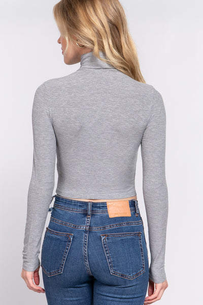 Get ready to turn heads and make a statement with our Long Sleeve Turtle Neck Rib Crop Knit Top in Heather Grey. Add it to your cart now and experience the perfect blend of fashion and comfort!
