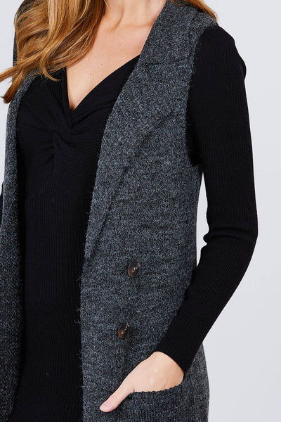 Introducing our Sleeveless Long Sweater Vest in the versatile Charcoal Grey shade, a chic and cozy addition to your wardrobe. This vest features a sleeveless design, notched collar, side pockets, and is crafted from a high-quality blend of 78% Acrylic, 15% Nylon, and 7% Polyester for warmth and comfort.