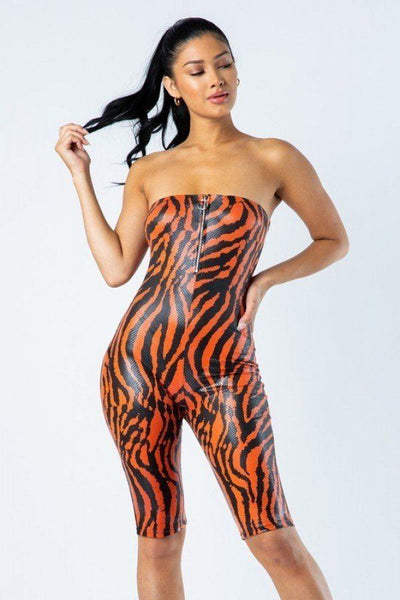 Zebra Print Tube Romper With Front O Ring Zipper Detail