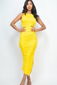 Add our sleeveless ruched side split maxi dress in Yellow to your cart now and embrace the perfect blend of fashion and comfort!