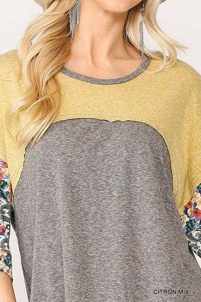 Colorblock Knit And Floral Print Mixed Top With Dolman Sleeve