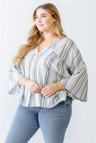 Add the Plus Light Blue Stripe Print Cotton Button-up Flare Hem Top to your cart now and embrace the perfect blend of comfort, style, and casual chic!