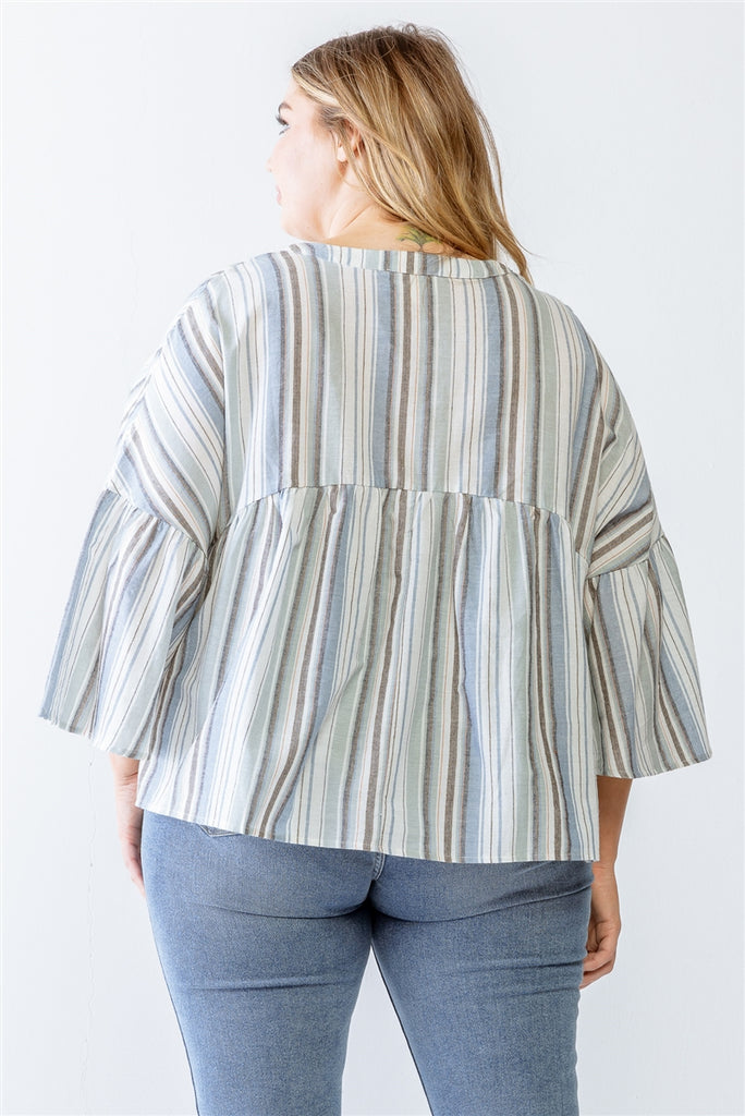 Plus Light Blue Stripe Print Cotton Button-up Flare Hem Top