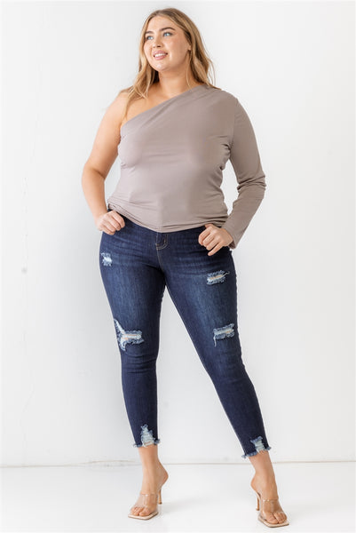 Elevate your style with our Plus Mocha Textured One-Shoulder Top—a chic and trendy addition to your wardrobe. This solid-colored top is designed to make a statement with its unique features and versatile appeal.